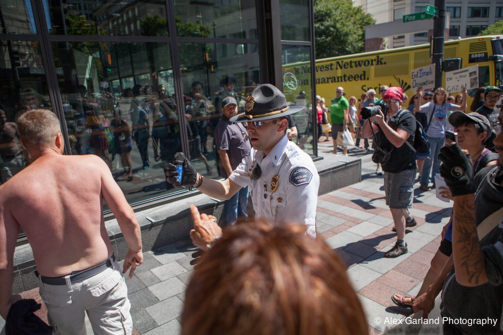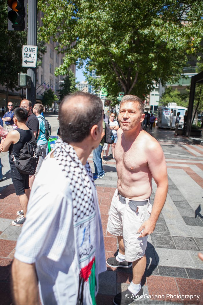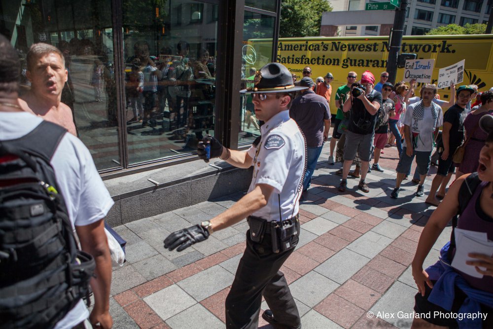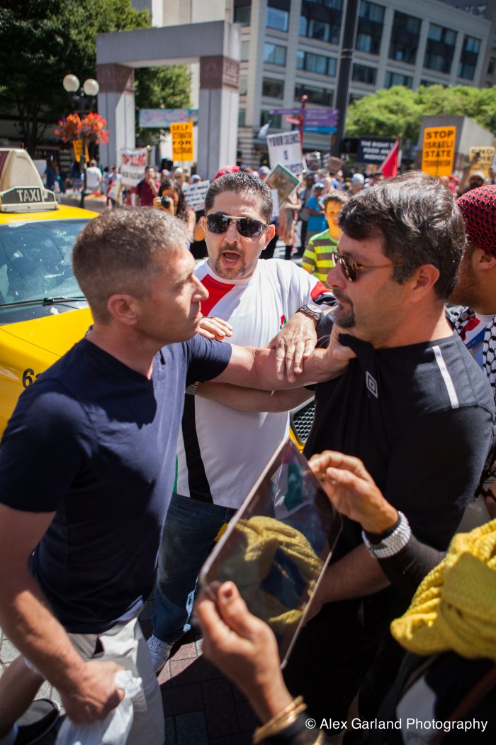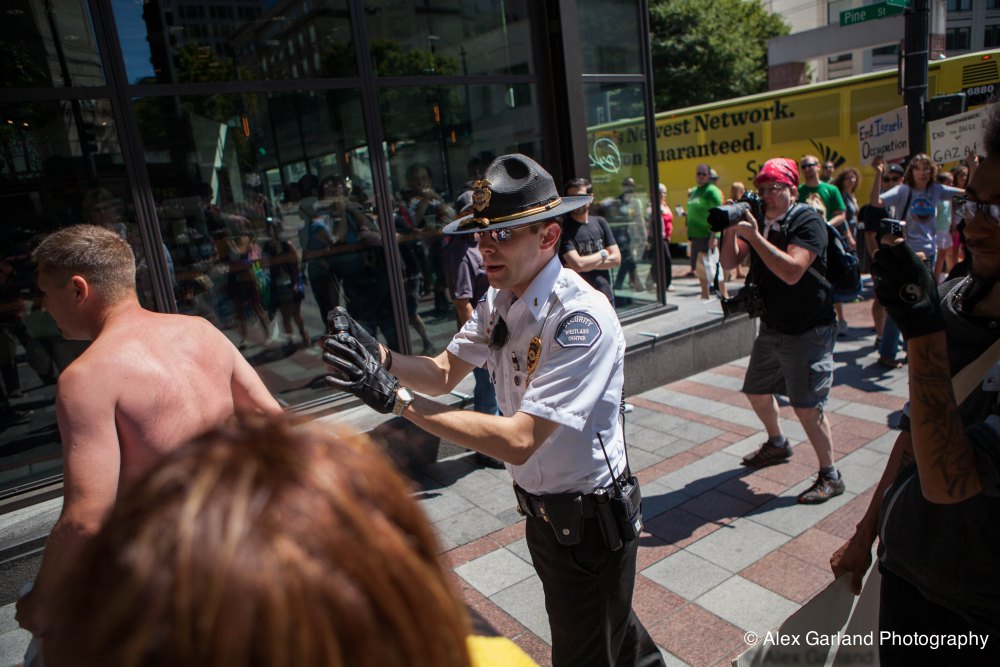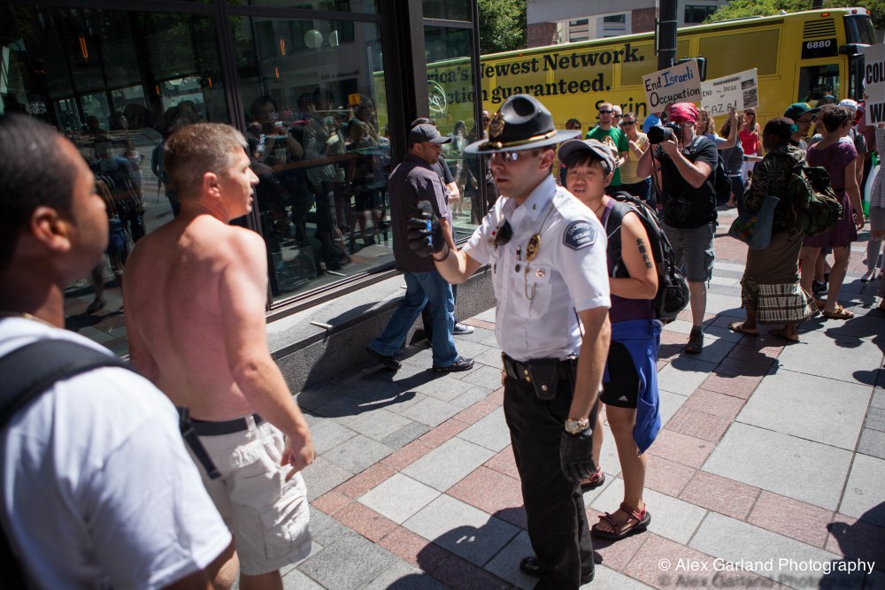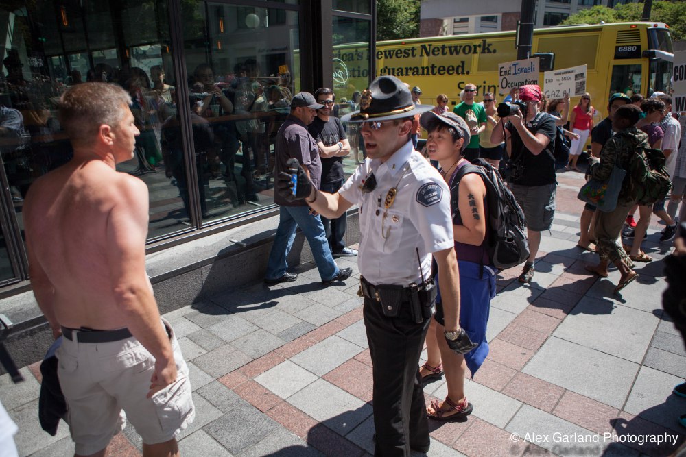 Demonstrators protest the violence in Gaza during a pro Palestine rally in Seattle. As protestors lined the sidewalks in Westlake Park, a pro Israel supporter walks by, harassing the demonstrators, yelling in peoples faces, screaming obscenities, and racial slurs. After crossing the street and harassing another group of demonstrators, the man tore off his shirt and began walking towards the group with fists clenched. As someone who wasn’t a part of the demonstration walked by, the pro Israel supporter turned and said something as he passed. The man then turned around as if he was going to swing, but thought better of it. The pro Israel supporter squared off with him, but a Westlake security guard who was watching the interaction pulled out his pepper spray, and sprayed the innocent passerby, grabbed him by the arm and tried to wrestle him to the ground. He was eventually led off into Westlake Center as SPD arrived on the scene.