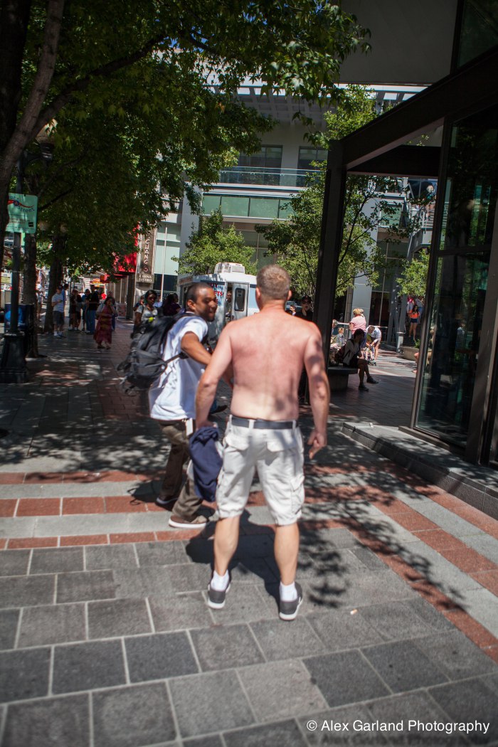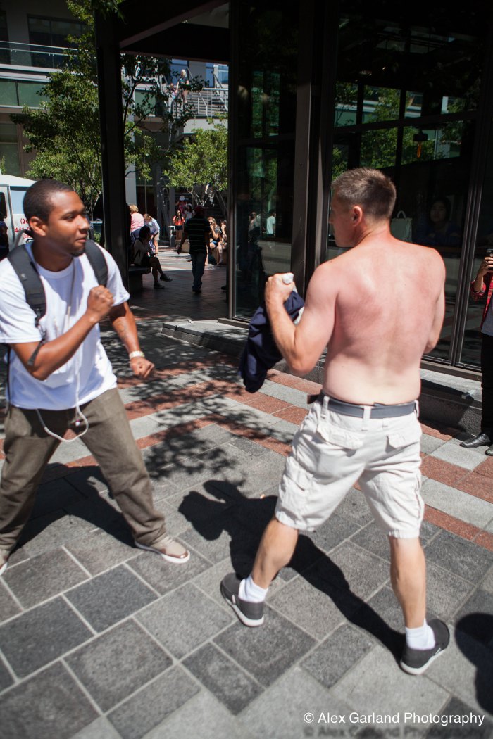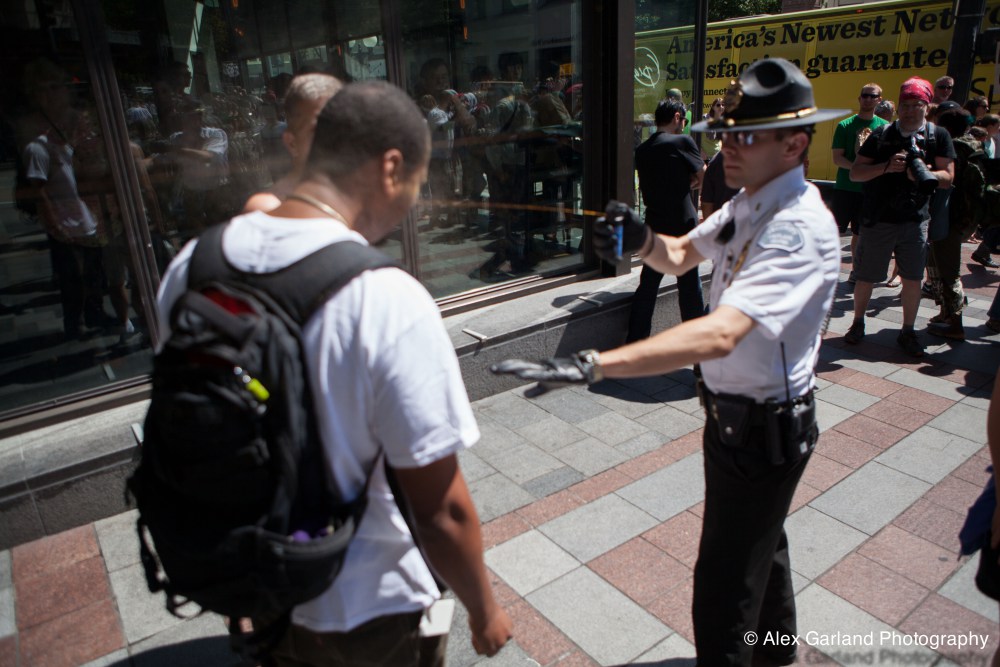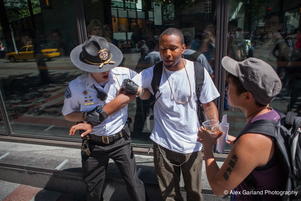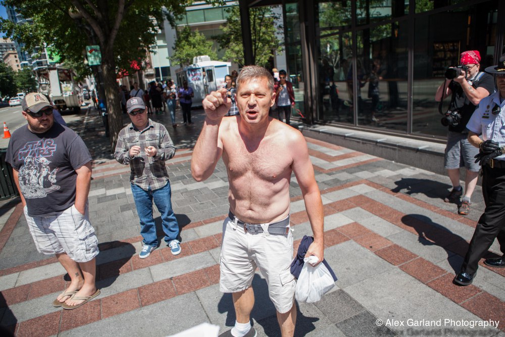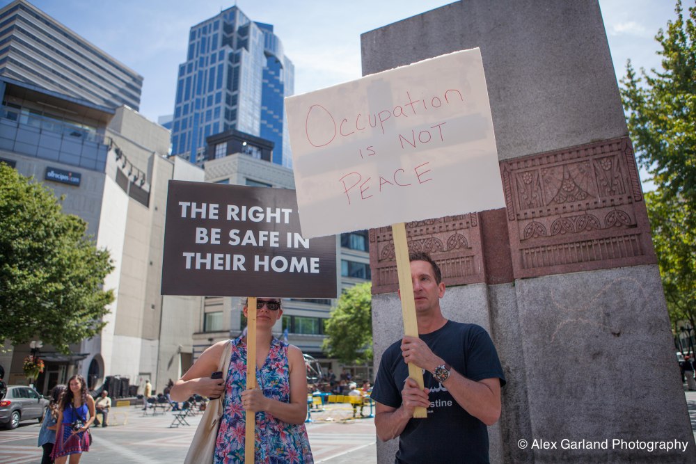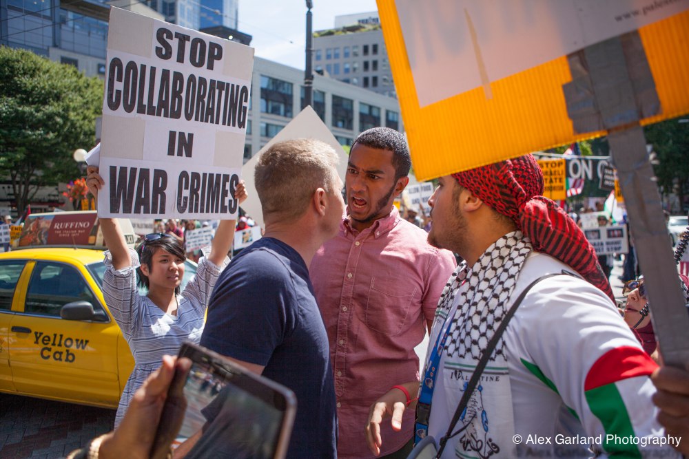 Demonstrators protest the violence in Gaza during a pro Palestine rally in Seattle. As protestors lined the sidewalks in Westlake Park, a pro Israel supporter walks by, harassing the demonstrators, yelling in peoples faces, screaming obscenities, and racial slurs. After crossing the street and harassing another group of demonstrators, the man tore off his shirt and began walking towards the group with fists clenched. As someone who wasn’t a part of the demonstration walked by, the pro Israel supporter turned and said something as he passed. The man then turned around as if he was going to swing, but thought better of it. The pro Israel supporter squared off with him, but a Westlake security guard who was watching the interaction pulled out his pepper spray, and sprayed the innocent passerby, grabbed him by the arm and tried to wrestle him to the ground. He was eventually led off into Westlake Center as SPD arrived on the scene.