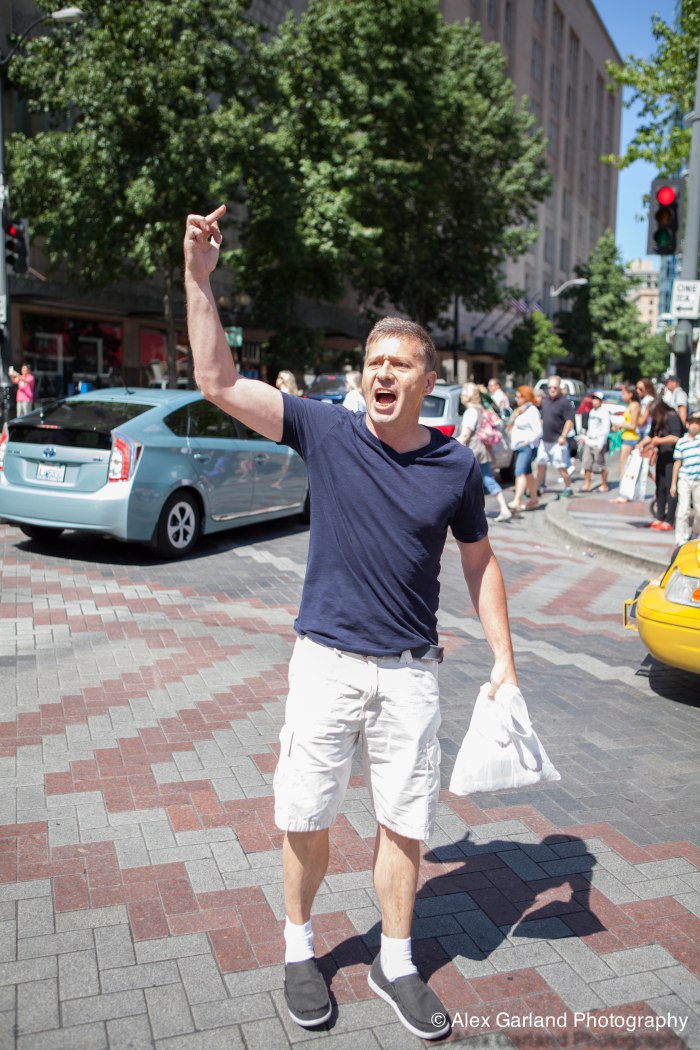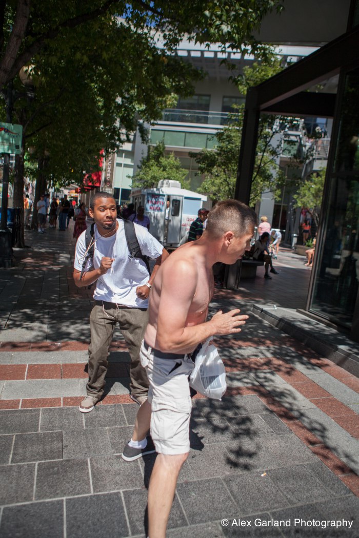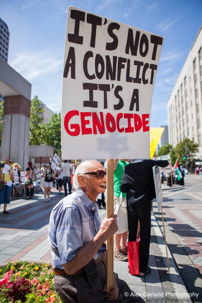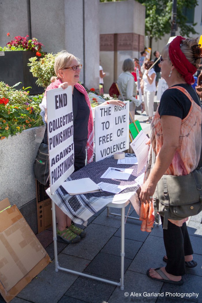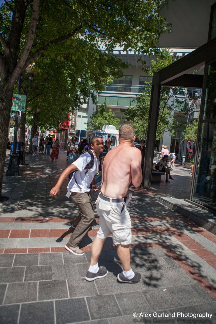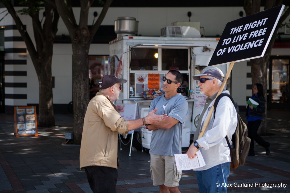 Demonstrators protest the violence in Gaza during a pro Palestine rally in Seattle. As protestors lined the sidewalks in Westlake Park, a pro Israel supporter walks by, harassing the demonstrators, yelling in peoples faces, screaming obscenities, and racial slurs. After crossing the street and harassing another group of demonstrators, the man tore off his shirt and began walking towards the group with fists clenched. As someone who wasn’t a part of the demonstration walked by, the pro Israel supporter turned and said something as he passed. The man then turned around as if he was going to swing, but thought better of it. The pro Israel supporter squared off with him, but a Westlake security guard who was watching the interaction pulled out his pepper spray, and sprayed the innocent passerby, grabbed him by the arm and tried to wrestle him to the ground. He was eventually led off into Westlake Center as SPD arrived on the scene.