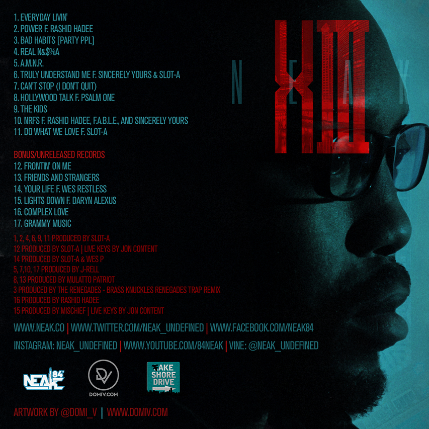 Well, well. Neak dropped this “XIII” blessing in the inbox, and we gave it a spin ’round the block. And viola! Now’s it’s on here for all y’all to love. Proclaimed a precursor to to the upcoming project “Paura/Amore” (due out this Spring), “XIII” boasts production by Slot-A, Rashid Hadee, The Renegades, J-Rell, Mulatto Patriot, Wes P, Mischief, and Jon Content. Vocal features include Psalm One, Sincerely Yours, Daryn Alexus, Wes Restless, F.A.B.L.E. and more.