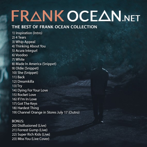 R&B vocalist Frank Ocean has kept his grind low, slow, and steady so far…and still, his reputation precedes him! Well, the time for this son of New Orleans to debut in full-length is approaching. In the meantime, we have this offering to hold us over. “The Best of Frank Collection†is a compilation of 24 tracks that includes music released by Frank Ocean himself, unreleased songs that surfaced online (some old, some more current), and four recordings of live performances that will likely be on his forthcoming debut album. Check the tracklisting below….