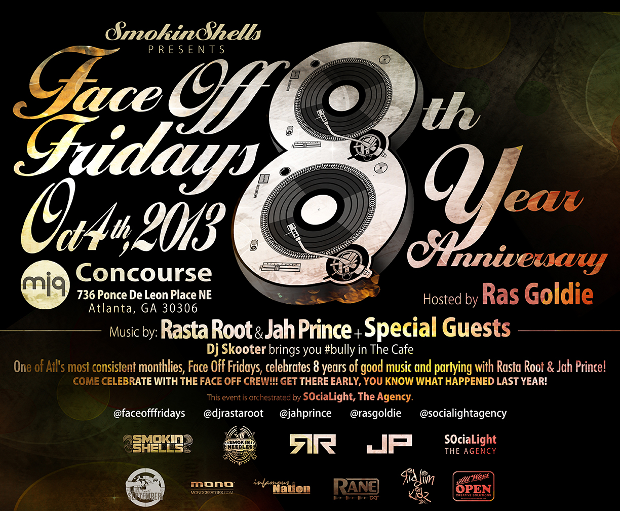 Face Off Fridays at MJQ Concourse in Atlanta is celebrating it’s 8th year anniversary. The monthly party has featured hundreds of special guests from recording artists, celebrities, athletes, & more all in the name of good music. The most important element to Face Off Friday’s is the Face Off team, the music, & the overall party itself. Tonight will be no different in Atlanta with many surprise guests scheduled to arrive. JAYFORCE.COM is a proud sponsor of tonight’s party but for now make sure you check out this special mix by DJ Rasta Root to get you right for tonight.