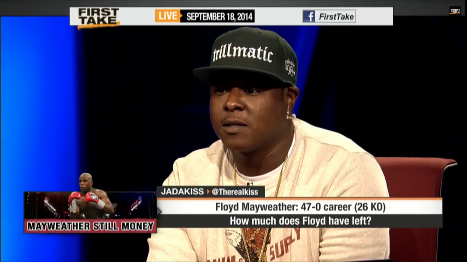 Jadakiss. Money Team affiliate and loyalist. Willing to trade jabs in a debate with Stephen A. Smith and Skip Bayless on ESPN’s First Take: On Floyd Mayweather’s recent fight with Marcos Maidana, how he’d do against Manny Pacquiao…