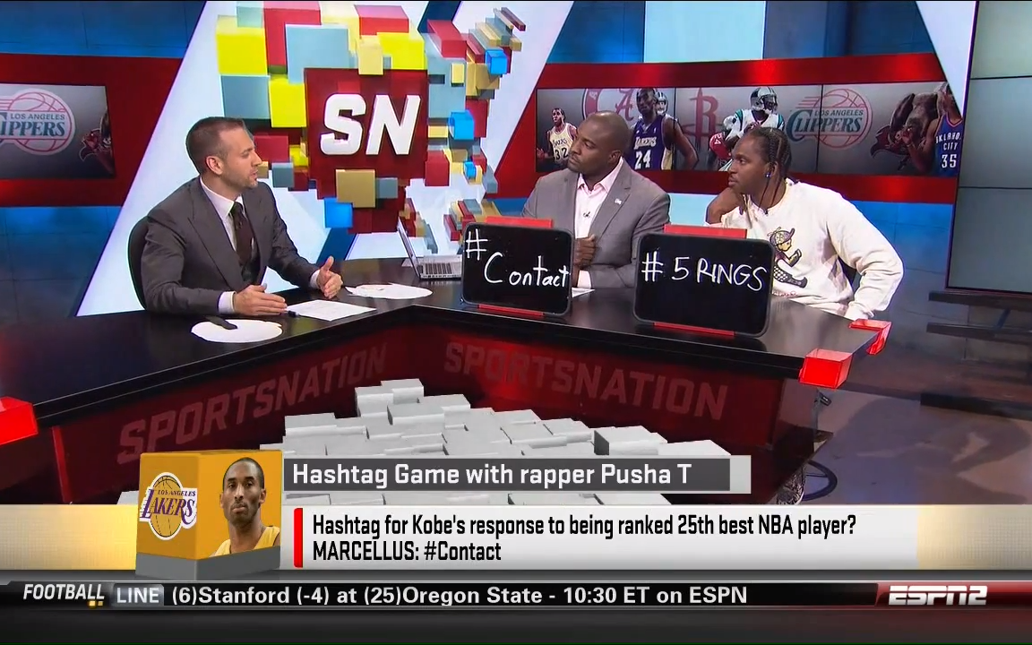 Pusha T appeared on ESPN’s SportsNation last week. Mr. Numbers on the Board gave the folks in the studio and at home the score on a potpourri of football and basketball topics… Vick, Kobe, Durant, the Lakers… Good fun talk TV.