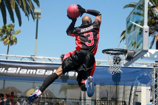 Just to review, or introduce… SlamBall is a bouncy-bouncy version of basketball played on floors with embedded trampolines to facilitate super-high leaps and bounds. As described in the above doc vid, the game is pretty ‘video gamish’ and due to business and sports culture trending downfalls, SlamBall got ‘slammed’ in the U.S. However, it has found life in China.