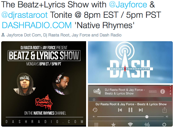 The Beatz+Lyrics Show with Jayforce x DJ Rastaroot Tonite 8pm EST / 5pm PST on DASHRADIO “Native Rhymes” Channel