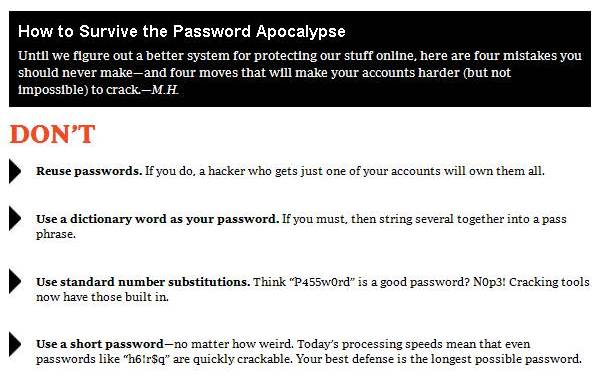 Since suffering at the hands of hackers (who, it turns out, just wanted to hijack his plumb of a Twitter handle @Mat), Mat devoted himself ‘to researching the world of online security…[and what he found] is utterly terrifying.’  In a very thorough write-up, Mat explores the problems… challenges… futility of trying to fully secure accounts and systems using passwords: Hackers using code and algorithms to successfully guess passwords to savvy evil-doers using new school cons to trick authorized personnel into giving up the goods.  Walking readers through it all, Mat comes to a chilling conclusion. We are dangerously exposed, and relying on current data security methods, relatively defenseless against those who want to access and do major damage to us using our data. Mat succinctly sums the security situation coldly: