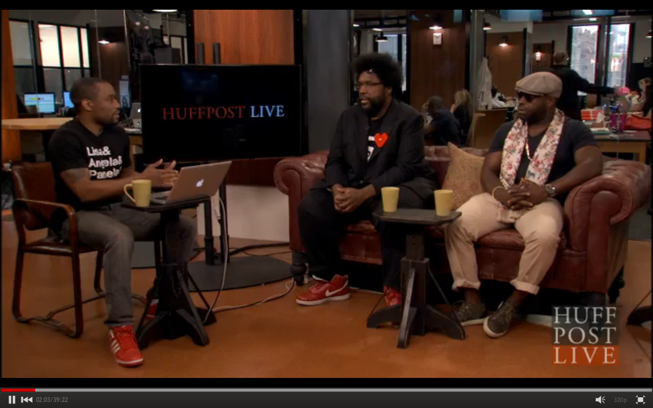 The Roots’ Black Thought and Questlove chat with HuffPost Live; speaking on (among other things) Kellogg’s cereal, the latest LP, their gig at The Tonight Show, playing with Dave Chappelle again, and going head-up with Boyz II Men in a high school talent show… and LOSING! Hahaaaa. Everybody made out okay since then though. All good. Good clip.
