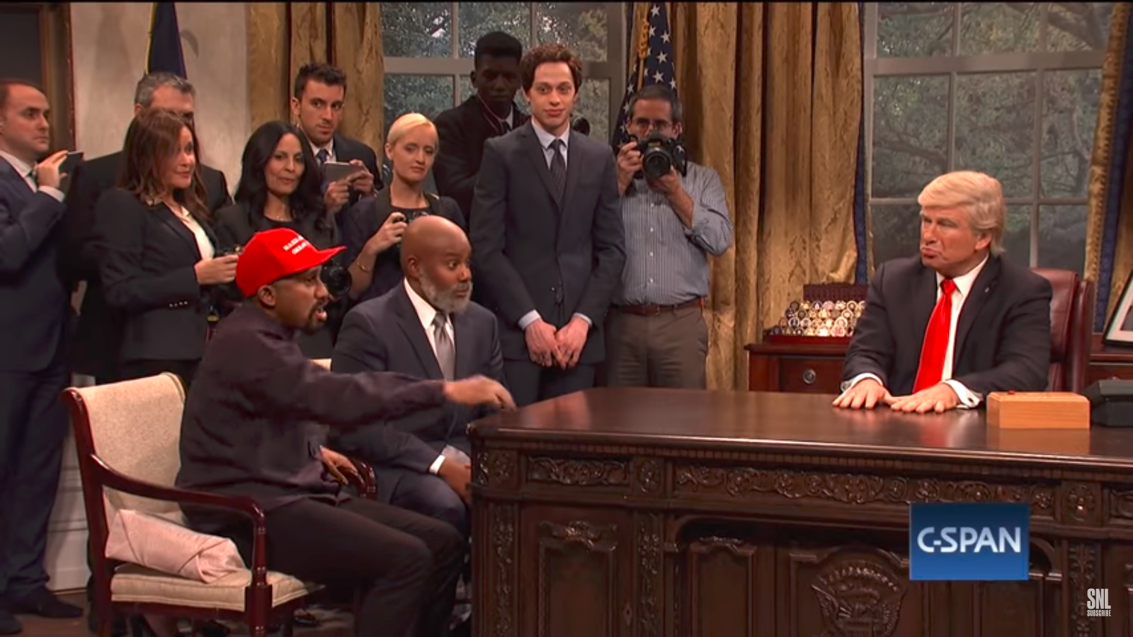Donald Trump (Alec Baldwin) meets with Kanye West (Chris Redd) and Jim Brown (Kenan Thompson) in the Oval Office.