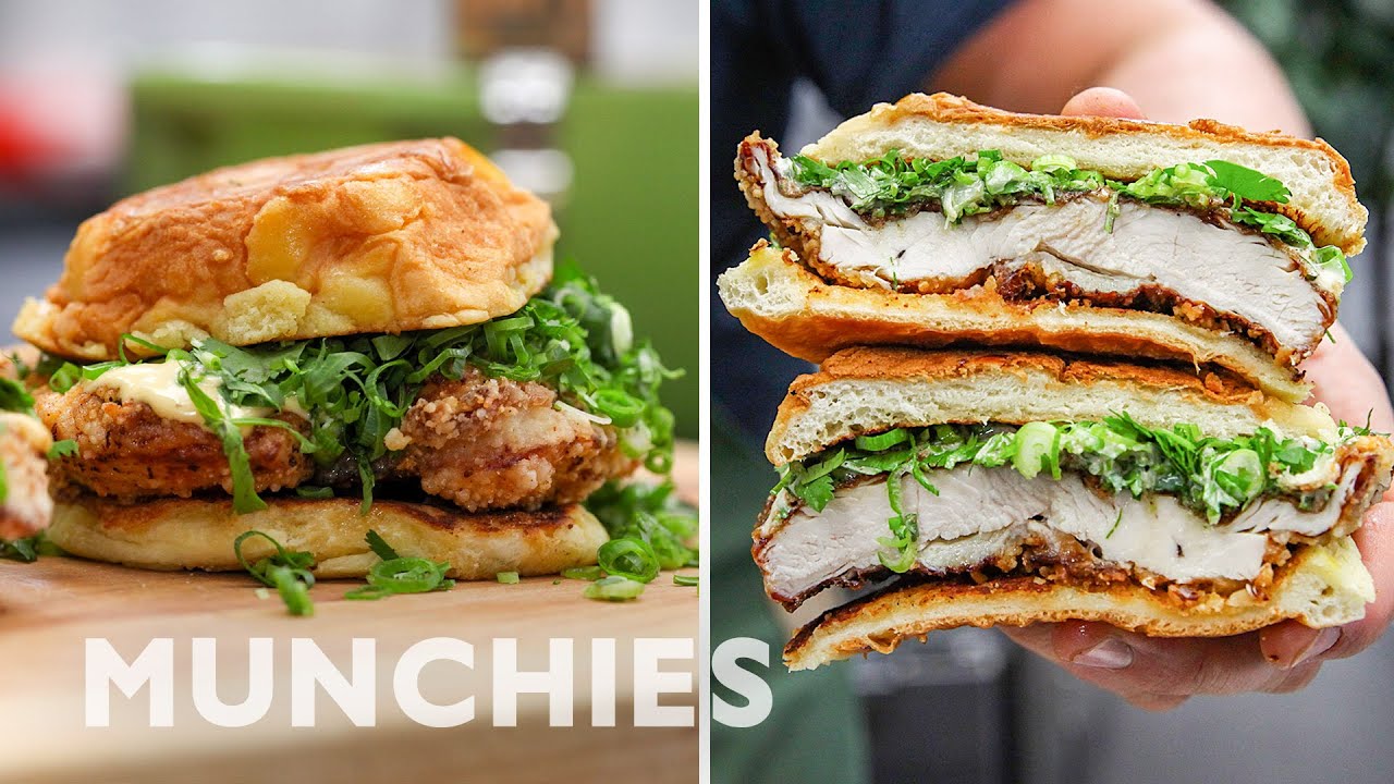 Trigg Brown of Win Son, a Taiwanese-American restaurant in Brooklyn, NY, makes a big chicken bun in the Munchies Test Kitchen. Trigg starts with breaking down a whole chicken before marinating it in a mixture of ginger, garlic, scallions, Chinese five spice powder, and shio koji. Big pieces of chicken breast and thighs are then dredged in sweet potato starch, corn starch and rice flour, fried, and dusted with more Chinese five spice powder and cayenne pepper.