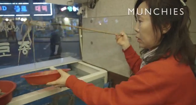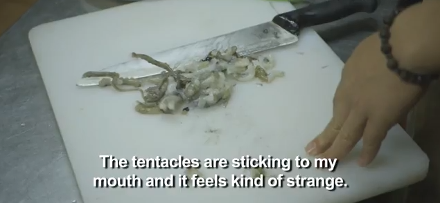 The people over at Munchies sent their correspondent Sydney Chun to a Seoul, Korea restaurant to report on the controversial practice of eating live octopus. Before watching the video I immediately recalled a previous incident of a South Korean woman eating cooked squid & she still became impregnated with 12 baby squid in her mouth. Doesn’t exactly look & sound appealing in addition to those type of risks, but every culture is different around the world. In the video above they have Head chef Kim Sang Jin show viewers the proper way to how to prepare the Octopus for human consumption. If you’re gonna eat Octopus you better pay careful attention, because getting impregnated in the mouth is the least of your worries. You could actually choke & die. Sheehz!
