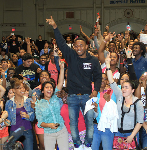 Kendrick Lamar stops by Mount Pleasant High School to serve as their celebrity principal-for-the-day, as part of the ‘Get Schooled’ program, after students there won The Fall Attendance Challenge!