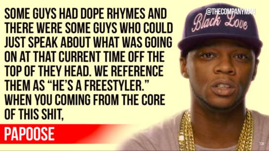 Interesting. Freestyle vs. off-the-top rhyming. Check out this revisitation of an MTV-televised discussion about historical misunderstandings and their perspectives on what freestyle is for real. Along with perspectives on freestyling in-the-streets vs in-the-industry from today (from Papoose).
